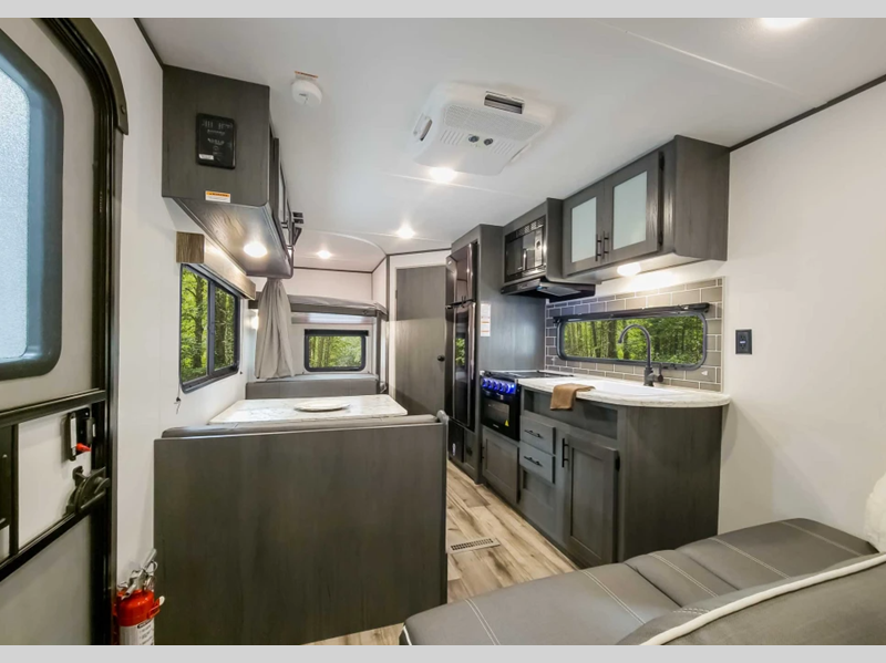 Sleeps 8 Slides 1 Length 31 ft Ext Height 11 ft 1 in Int Height 6 ft 10 in Hitch Weight 836 lbs Dry Weight 6099 lbs Cargo Capacity 1501 lbs Fresh Water Capacity 45 gals Grey Water Capacity 42 gals Black Water Capacity 42 gals Number Of Bunks 2 Available Beds Queen Refrigerator Type 12V Cooktop Burners 3 Number of Awnings 1 LP Tank Capacity 20 lbs AC BTU 15000 btu Awning Info 16' Power w/LED Light Axle Count 2 Number of LP Tanks 2 Shower Type Standard Solar Wattage 100 watts Similar Floorplans