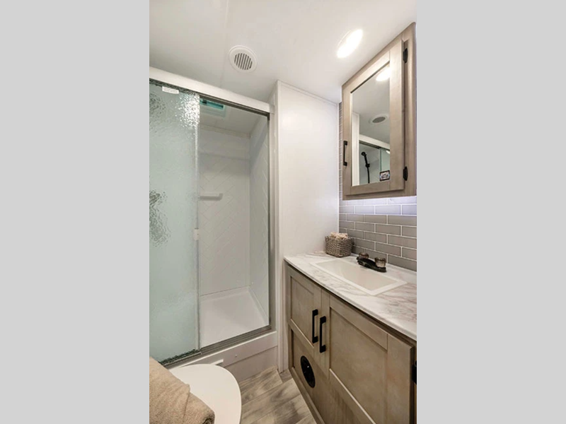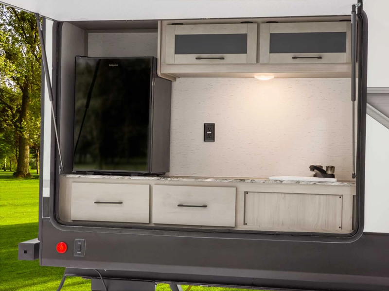 Each model comes standard with aluminum entry steps for stability when entering and exiting your RV, and the heated and enclosed underbelly adds extra protection to your unit. You will enjoy a residential king bed for comfort, a 6' 8" interior height that will make it feel more like home, plus roller night shades for privacy when you want it. And we haven't even touched on the exterior features you are sure to love, like the Bear Cave storage, adjustable power awning, exterior spray port to wash of hiking gear, and so much more!