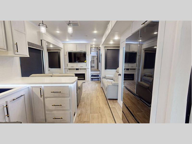 Sleeps 9 Slides 3 Length 46 ft 8 in Ext Height 13 ft 3 in Interior Color Platinum, Midnight Hitch Weight 3680 lbs Dry Weight 16260 lbs Cargo Capacity 3740 lbs Fresh Water Capacity 150 gals Grey Water Capacity 84 gals Black Water Capacity 84 gals Tire Size 16" Generator Onan 5.5kW Gas Fuel Capacity 60 gals Number Of Bunks 1 Available Beds King Refrigerator Type Gas/Electric Four Door Refrigerator Size 18 cu ft Cooktop Burners 3 Number of Awnings 3 Axle Weight 7000 lbs Garage Size 13 ft Water Heater Type On Demand Tankless TV Info LR 50" LCD HDTV, Garage TV Awning Info 21' Electric with LED Lights; 10' Power, Ramp Awning Axle Count 3 Shower Type Walk-In Shower Electrical Service 50 amp Similar Floorplans