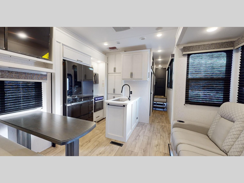 Sleeps 9 Slides 3 Length 44 ft 10 in Ext Height 13 ft 3 in Interior Color Midnight, Platinum Hitch Weight 3070 lbs Dry Weight 15411 lbs Cargo Capacity 4589 lbs Fresh Water Capacity 94 gals Grey Water Capacity 88 gals Black Water Capacity 88 gals Tire Size 16" Fuel Capacity 30 gals Number Of Bunks 1 Available Beds King Refrigerator Type Gas/Electric Refrigerator Size 18 cu ft Cooktop Burners 3 Number of Awnings 1 Axle Weight 7000 lbs Garage Size 13 ft Water Heater Type On demand Tankless TV Info LR 50" TV Awning Info 21' Electric with LED Lights Axle Count 3 Shower Type Walk-In Shower Electrical Service 50 amp Similar Floorplans