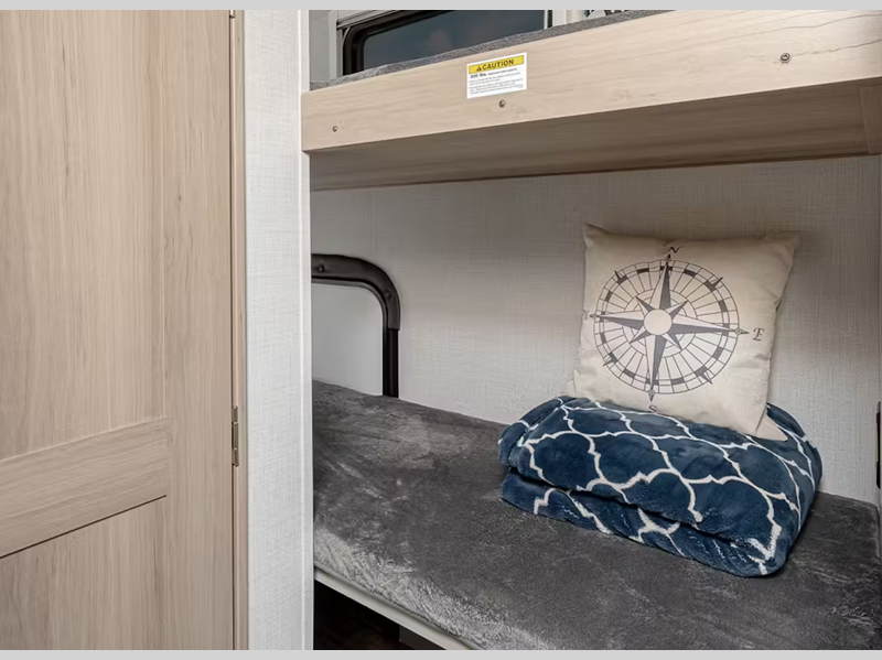 Sleeps 4 Slides 1 Length 22 ft 1 in Ext Height 10 ft 7 in Interior Color Cashmere, Liam Hitch Weight 490 lbs Dry Weight 4331 lbs Cargo Capacity 1169 lbs Fresh Water Capacity 37 gals Grey Water Capacity 30 gals Black Water Capacity 30 gals Tire Size ST235/75R15D Furnace BTU 20000 btu Number Of Bunks 2 Available Beds Full Refrigerator Size 4.5 cu ft Cooktop Burners 3 Number of Awnings 1 Axle Weight 5100 lbs LP Tank Capacity 20 lbs. Water Heater Type On Demand AC BTU 18000 btu TV Info 32" HDTV Awning Info 14' Power w/Lights and Adjustable Arms Axle Count 1 Number of LP Tanks 2 Shower Type Standard Similar Floorplans