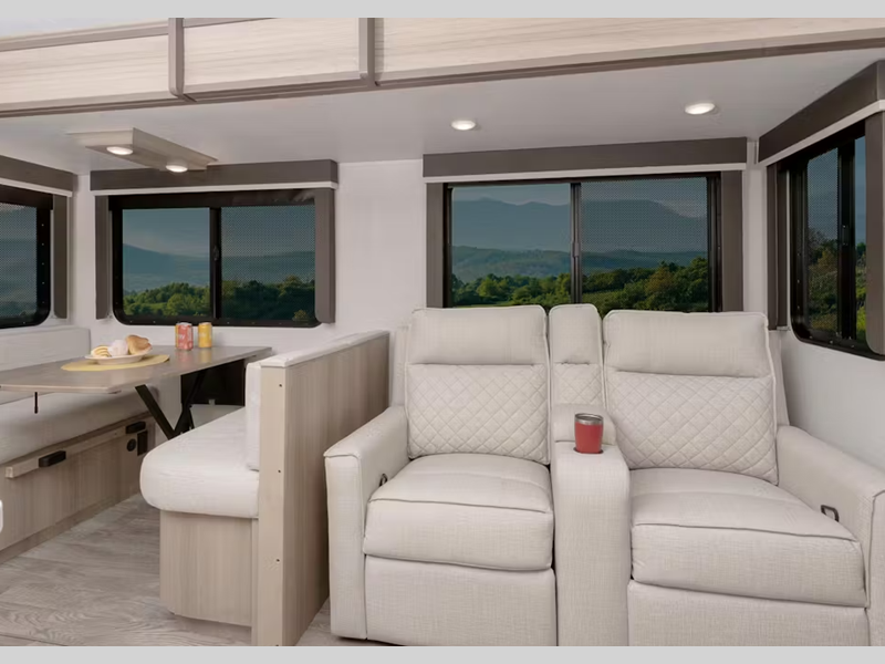 Sleeps 8 Slides 2 Length 37 ft 5 in Ext Height 11 ft 4 in Int Height 6 ft 6 in Interior Color Stone, Tobacco Exterior Color Royal Gold, Obsidian Hitch Weight 1055 lbs Dry Weight 8220 lbs Cargo Capacity 2280 lbs Fresh Water Capacity 54 gals Grey Water Capacity 76 gals Black Water Capacity 38 gals Tire Size ST225/75R15E Furnace BTU 35000 btu Number Of Bunks 2 Available Beds King Refrigerator Type 12V GE Refrigerator Size 10 cu ft Cooktop Burners 3 Shower Size 30" x 40" Number of Awnings 1 Axle Weight 5100 lbs Garage Size 6 ft 10 in LP Tank Capacity 30 lbs Water Heater Type On Demand AC BTU 15000 btu TV Info LR 50" HDTV Awning Info Power Lighted w/Adjustable Arms Axle Count 2 Number of LP Tanks 2 Shower Type Standard Electrical Service 50 amp Similar Floorplans