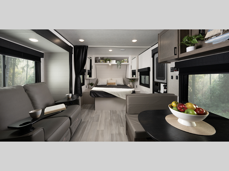 Sleeps 5 Slides 1 Length 22 ft 2 in Ext Width 8 ft Ext Height 10 ft 7 in Int Height 6 ft 9 in Interior Color Sandy Grey Hitch Weight 405 lbs GVWR 4995 lbs Dry Weight 3785 lbs Cargo Capacity 1210 lbs Fresh Water Capacity 20 gals Grey Water Capacity 20 gals Black Water Capacity 20 gals Tire Size ST225/75R15'D Furnace BTU 18000 btu Number Of Bunks 2 Refrigerator Type 12V Refrigerator Size 8 cu ft Cooktop Burners 2 Number of Awnings 1 LP Tank Capacity 20 lbs Water Heater Capacity 6 gal Water Heater Type Gas/Electric AC BTU 13500 btu Awning Info 11' Power with LED Lights Axle Count 1 Number of LP Tanks 1 Shower Type Tub/Shower Combo Similar Floorplans
